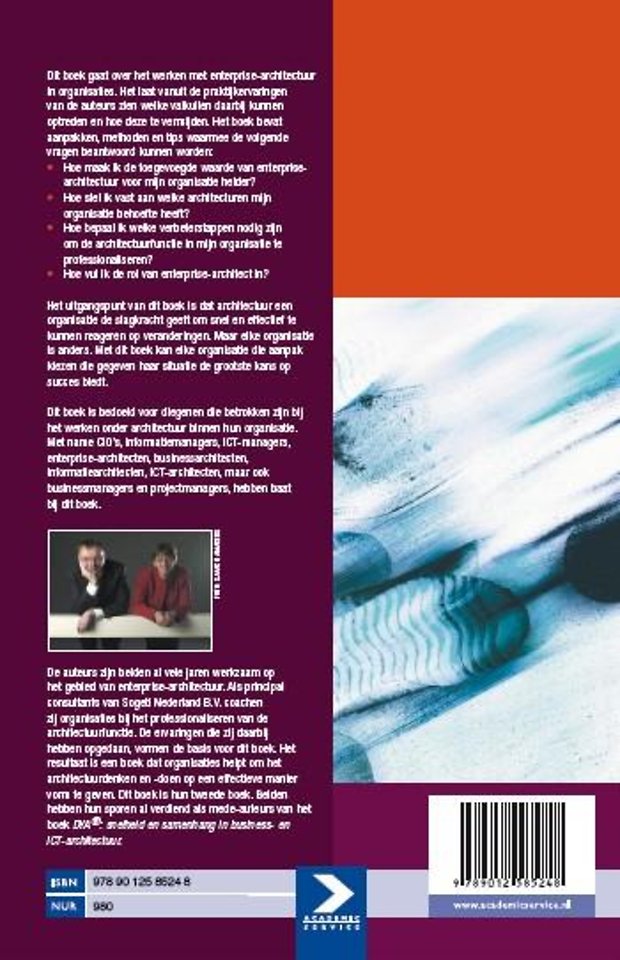 Het uitgangspunt van dit boek is dat architectuur een organisatie de slagkracht geeft om snel en effectief te kunnen reageren op veranderingen. Maar elke organisatie is anders. Met dit boek kan elke organisatie die aanpak kiezen die gegeven haar situatie de grootste kans op succes biedt.