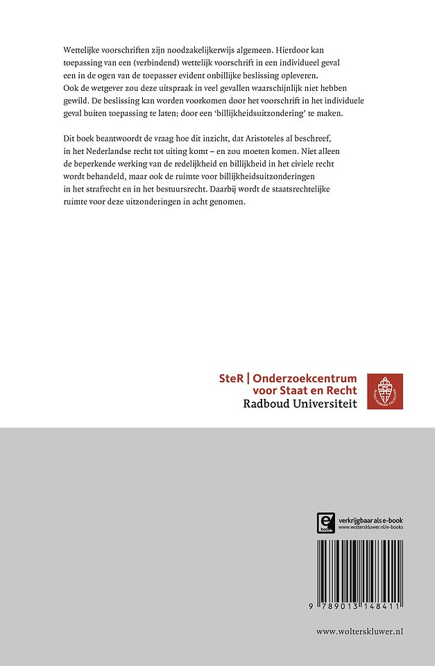 De uitgave verkent hoe billijkheidsuitzonderingen worden gemaakt in het civiele recht, het strafrecht en het bestuursrecht. Vaak gebeurt dit onder verschillende noemers, waardoor het ontbreekt aan een algemeen leerstuk in literatuur en jurisprudentie. Dat leidt ertoe dat rechters geregeld billijkheidsuitzonderingen voor specifieke gevallen over het hoofd zien. Deze titel brengt daarom uiteenlopende leerstukken samen onder één noemer.