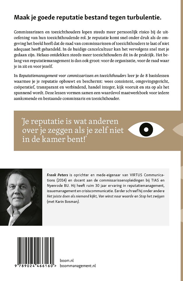 Iedere commissaris of toezichthouder heeft te maken met de eigen reputatie en die van de raad van commissarissen en de organisatie waarop hij toezicht houdt. Het belang van reputatiemanagement is dan ook groot, voor de organisatie, voor de raad waar je in zit en voor jezelf. Het huidige socialmediatijdperk heeft ervoor gezorgd dat de wereld steeds transparanter wordt en er steeds minder verborgen blijft. Je reputatie is daarmee kwetsbaarder dan ooit. Er is maar één gerichte negatieve tweet nodig om deze te beschadigen of kwijt te raken.