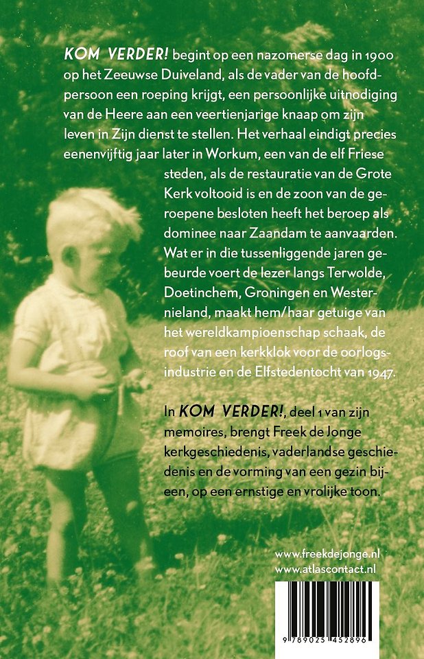 'Kom verder!' van Freek de Jonge begint op een nazomerse dag in 1900 op het Zeeuwse Duiveland, als de vader van de hoofdpersoon een roeping krijgt, een persoonlijke uitnodiging van de Heere aan een veertienjarige knaap om zijn leven in Zijn dienst te stellen.