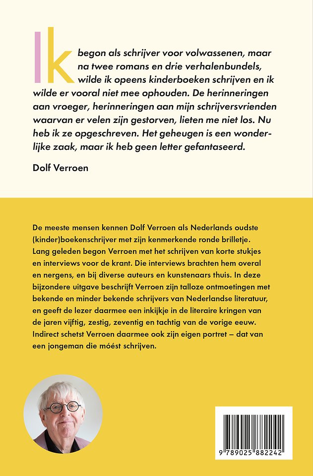 De meeste mensen kennen Dolf Verroen als Nederlands oudste kinderboekenschrijver met zijn kenmerkende ronde brilletje. Lang geleden begon Verroen met het schrijven van korte stukjes en interviews voor de krant. Die interviews brachten hem overal en nergens, en bij diverse auteurs thuis. In deze bijzondere uitgave beschrijft Verroen zijn talloze ontmoetingen met bekende en minder bekende schrijvers van Nederlandse
