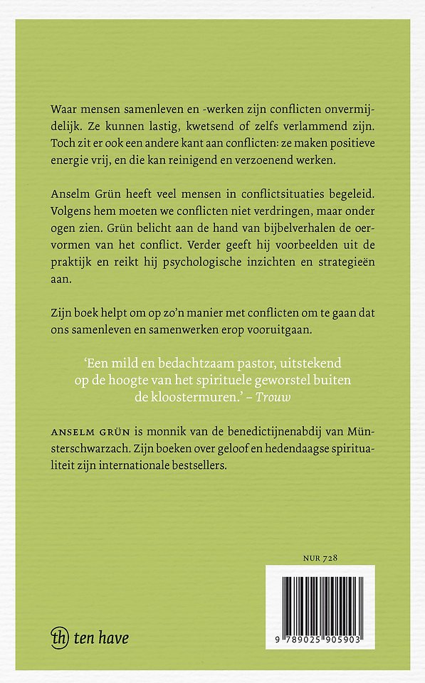 Monnik en therapeut Anselm Grün stelt in Omgaan met conflicten dat waar mensen samenleven en -werken conflicten onvermijdelijk zijn. Lastig, maar in een conflict komt ook positieve energie vrij, die reinigend en verzoenend kan werken.