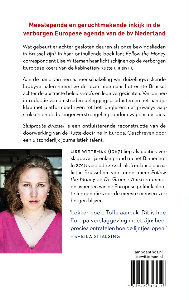 Sluiproute Brussel van Lise Witteman vertelt hoe de beruchte Rutte-doctrine ook op Europees niveau doorwerkt. Wat gebeurt er achter gesloten deuren als onze bewindslieden naar Brussel afreizen? Zijn ze wel eerlijk naar ons over de belangen die ze behartigen en de akkoorden die ze sluiten wanneer ze met hun Europese collega’s onderhandelen? Of houden ze er een verborgen agenda op na, één die ze liever verhullen omdat er anders gedoe van komt?