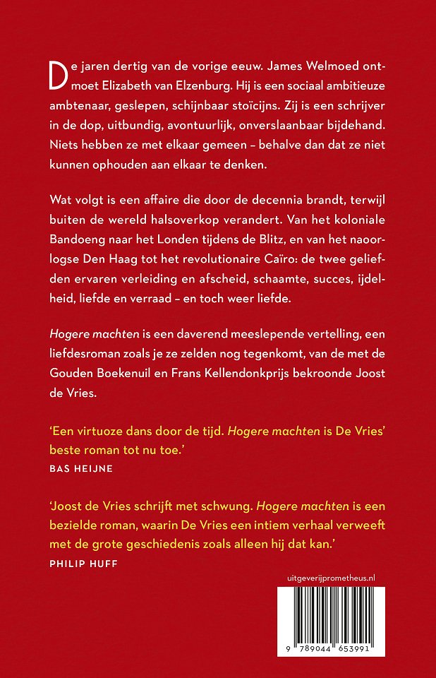 'Hogere machten' is een daverend meeslepende vertelling, een liefdesroman zoals je ze zelden nog tegenkomt, van de met de Gouden Boekenuil en Frans Kellendonkprijs bekroonde Joost de Vries.