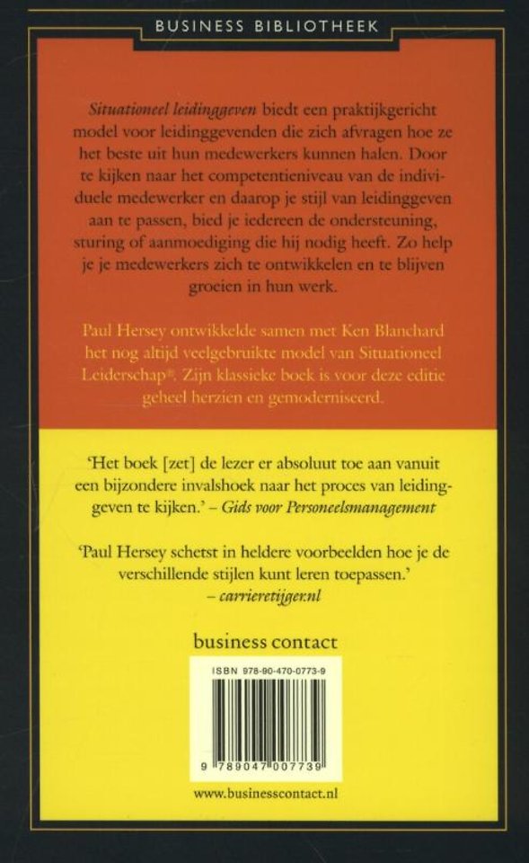 Situationeel leiding geven volgt een manager die genoodzaakt is resultaten te boeken, ondergeschikten te scholen en een bijdrage te leveren aan het succes van de onderneming. Spelenderwijs wordt de lezer vertrouwd gemaakt met een model voor het uitstippelen van strategieën om met succes het hoofd te kunnen bieden aan allerlei problemen waarmee leidinggevende functionarissen worden geconfronteerd. Het model situationeel leiding geven is niet alleen voor managers een uitstekend hulpmiddel: iedereen die zich beroepshalve of privé bezighoudt met het beïnvloeden en veranderen van mensen (opvoeders, ouders, leerkrachten, psychotherapeuten, geestelijken, enz.) kan ermee werken. Ook werknemers, de mensen die leiding ontvangen, kunnen er hun voordeel mee doen.