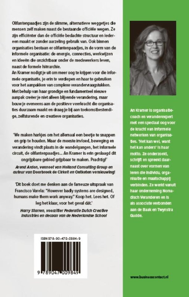 Meer over An KramerOlifantenpaadjes zijn de slimme, alternatieve weggetjes die mensen zelf maken naast de bestaande officiële wegen. Ze zijn efficiënter dan de officiële bedachte structuur en iedereen maakt er zonder aarzeling gebruik van. An Kramer laat zien dat er ook binnen organisaties olifantenpaadjes bestaan, in de vorm van de informele organisatie: de energie, connecties, werkwijzen en ideeën die onzichtbaar onder de medewerkers leven, naast de formele hiërarchie.