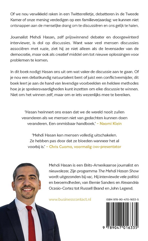 Meer over Mehdi HasanIn 'Win elke discussie' nodigt journalist Mehdi Hasan ons uit om wat vaker de discussie aan te gaan. Of je nou een debatkundig natuurtalent bent of juist een conflictvermijder, dit boek leert je aan de hand van levendige voorbeelden en heldere methodes hoe je je sprekersvaardigheden kunt inzetten om elke discussie te winnen. Niet om het winnen zelf, maar om er iets wezenlijks mee te bereiken.