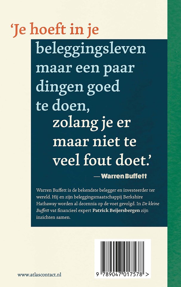 Buffetts filosofie is een wonder van eenvoud en gezond verstand; hij gaat voorbij aan de hypes van de dag. Wie met dit boekje in de hand de beurs volgt, leert op een systematische manier te kijken naar bedrijven en hun beleggingspotentieel. Rendement verzekerd!