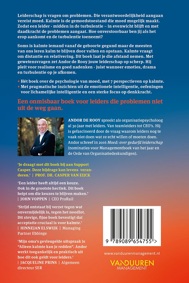 Soms is een kalme gemoedstoestand iemand vanaf de geboorte gegund, maar de meesten van ons zijn gewone mensen die door vallen en opstaan kalmer worden. Voor kalmte is distantie noodzakelijk. Dit boek laat de lezer die afstand nemen en maakt helder hoe een leider op kritieke momenten in een gemoedstoestand van kalmte komt en blijft. Zodat hij de problemen met moed aangaat en tot betere besluiten komt voor zichzelf en de organisatie.