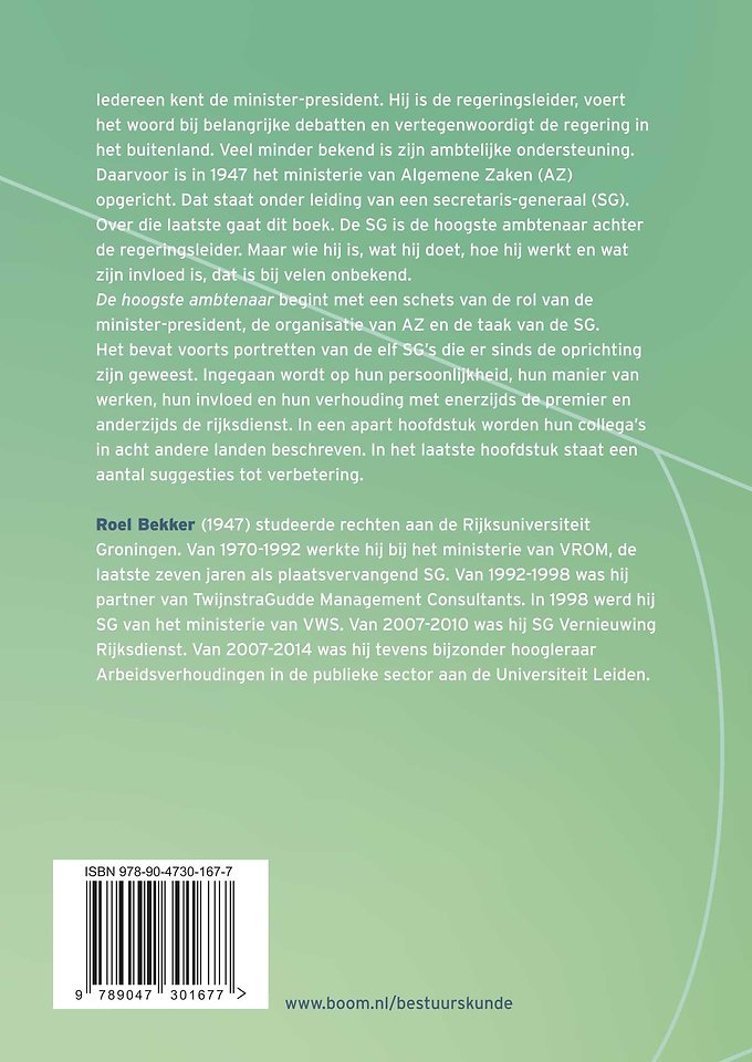 Iedereen kent de minister-president. Hij is de regeringsleider, voert het woord bij belangrijke debatten, vertegenwoordigt de regering in het buitenland. Veel minder bekend is zijn ambtelijke ondersteuning. Daarvoor is in 1947 het ministerie van Algemene Zaken (AZ) opgericht. Dat staat onder leiding van een secretarisgeneraal (SG). Over die laatste gaat dit boek. Hij is de hoogste ambtenaar achter de regeringsleider. Maar wie die SG is, wat hij doet, hoe hij werkt, wat zijn invloed is, dat is bij velen onbekend.