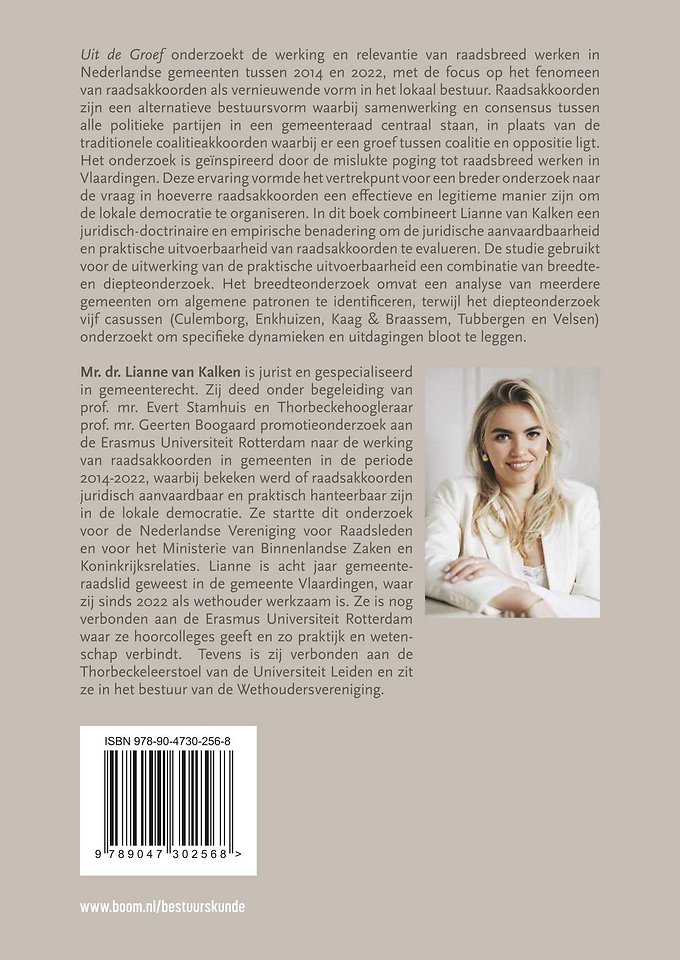 Het proefschrift 'Uit de Groef' onderzoekt de werking en relevantie van raadsbreed werken in Nederlandse gemeenten tussen 2014 en 2022, met de focus op het fenomeen van raadsakkoorden als vernieuwende vorm in het lokaal bestuur. Raadsakkoorden zijn een alternatieve bestuursvorm waarbij samenwerking en consensus tussen alle politieke partijen in een gemeenteraad centraal staan, in plaats van de traditionele coalitieakkoorden waarbij er een groef tussen coalitie en oppositie ligt.