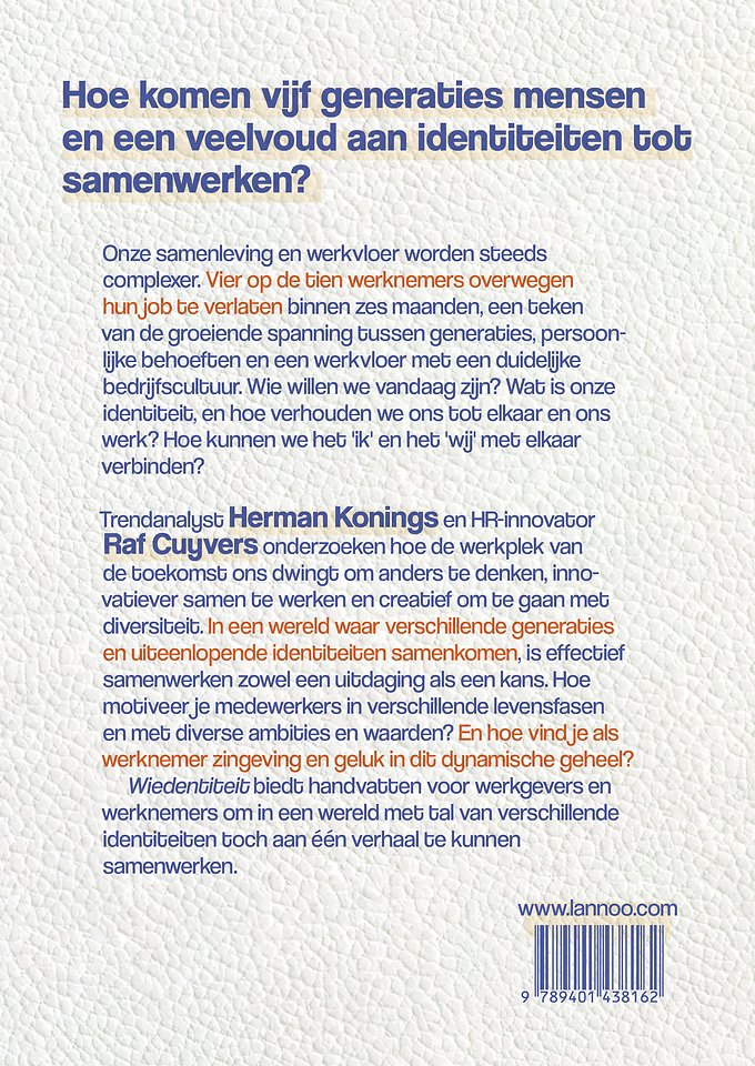 Meer over de auteursOnze samenleving en werkvloer worden steeds complexer. Vier op de tien werknemers overwegen hun job te verlaten binnen zes maanden, een teken van de groeiende spanning tussen generaties, persoonlijke behoeften en een werkvloer met een duidelijke bedrijfscultuur. Wie willen we vandaag zijn? Wat is onze identiteit, en hoe verhouden we ons tot elkaar en ons werk? Hoe kunnen we het 'ik' en het 'wij' met elkaar verbinden?