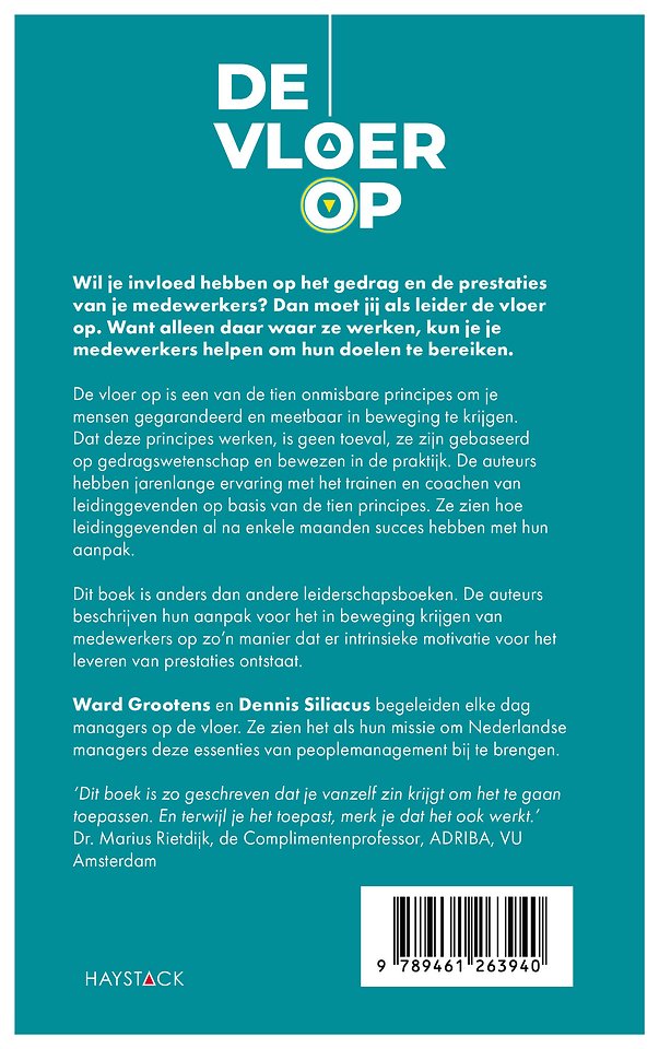 De vloer op is een van de tien onmisbare principes om je mensen gegarandeerd en meetbaar in beweging te krijgen. Dat deze principes werken, is geen toeval, ze zijn gebaseerd op gedragswetenschap en bewezen in de praktijk. De auteurs hebben jarenlange ervaring met het trainen en coachen van leidinggevenden op basis van de tien principes. Ze zien hoe leidinggevenden al na enkele maanden succes hebben met hun aanpak.