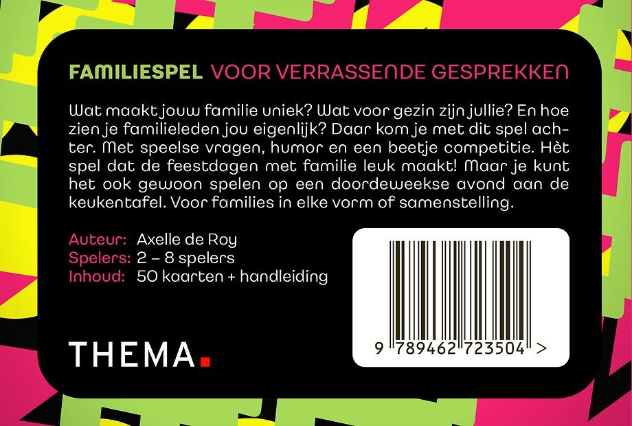 Met speelse vragen, humor en een beetje competitie zorgt dit familiespel op een laagdrempelige manier voor een prettig en verrassend gesprek dat je spelenderwijs kunt voeren met jouw familieleden. Het gezellige kaartspel garandeert mooie gesprekken, op een luchtige manier.