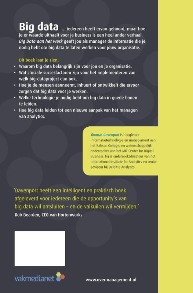 'Davenport heeft een intelligent en praktisch boek afgeleverd voor iedereen die de opportunity’s van big data wil ontsluiten-en de valkuilen wil vermijden' - Rob Bearden, CEO van Hortonworks