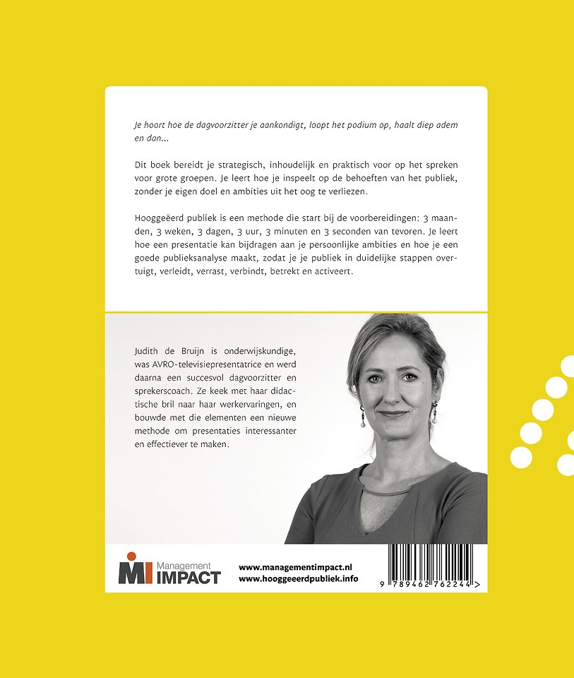 Hooggeëerd publiek is een methode die start bij de voorbereidingen: 3 maanden, 3 weken, 3 dagen, 3 uur, 3 minuten en 3 seconden van tevoren. Je leert hoe een presentatie kan bijdragen aan je persoonlijke ambities en hoe je een goede publieksanalyse maakt, zodat je je publiek in duidelijke stappen overtuigt, verleidt, verrast, verbindt, betrekt en activeert.