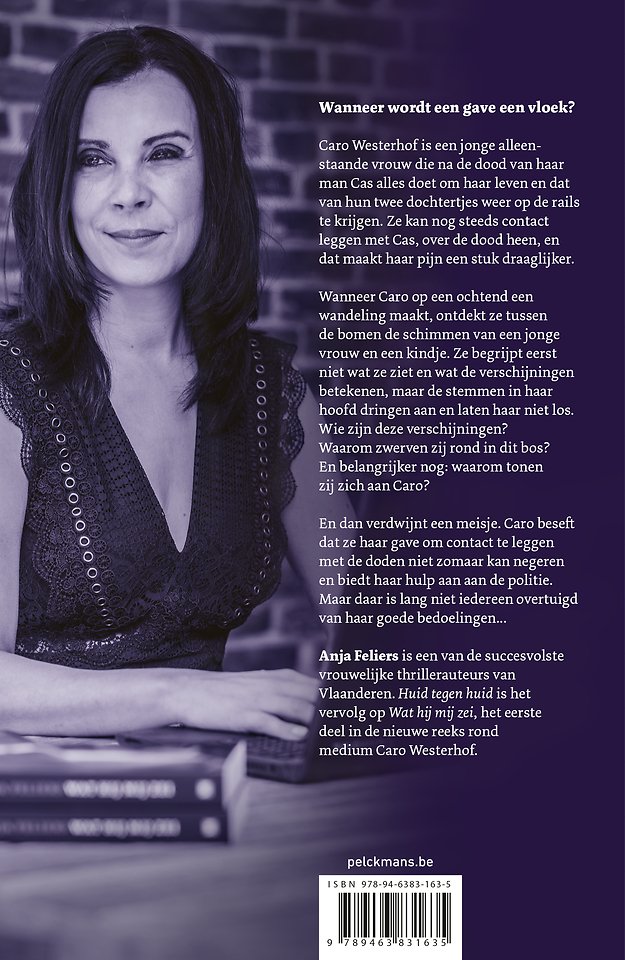 Anja Feliers is een van de succesvolste vrouwelijke thrillerauteurs van Vlaanderen. Huid tegen huid is het vervolg op Wat hij mij zei, het eerste deel in de nieuwe reeks rond medium Caro Westerhof.